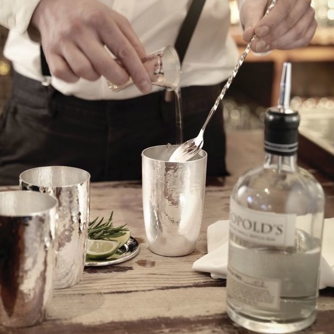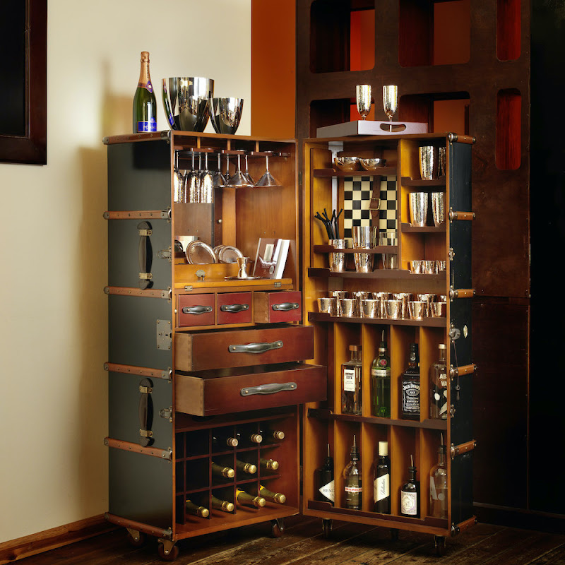 | Bar wagen vervaardigd uit geolied Eiken De reling van de barwagen is van roestvrij staal, bekleed met nappa leer in Beige of Ocean Blue Gewicht: ongeveer 29 kg.
