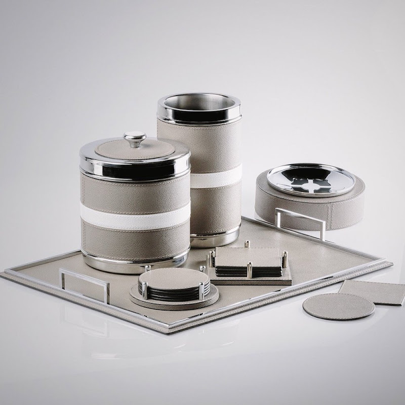 Deels met leer beklede,isolerende wijnkoeler in verchroomd staal.