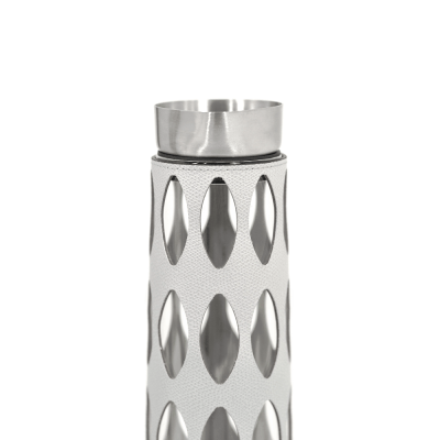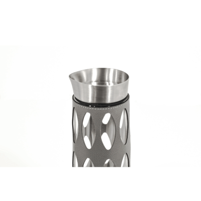 Glazen karaf met verwijderbare leren hoes. Mat roestvrij stalen schenktuit