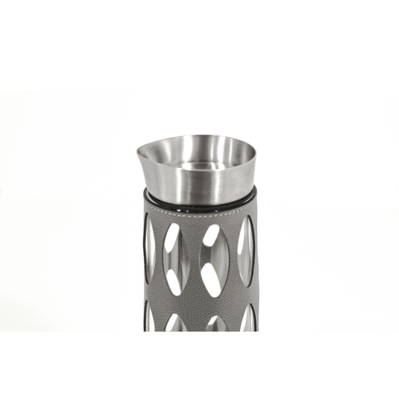 Glazen karaf met verwijderbare leren hoes. Mat roestvrij stalen schenktuit