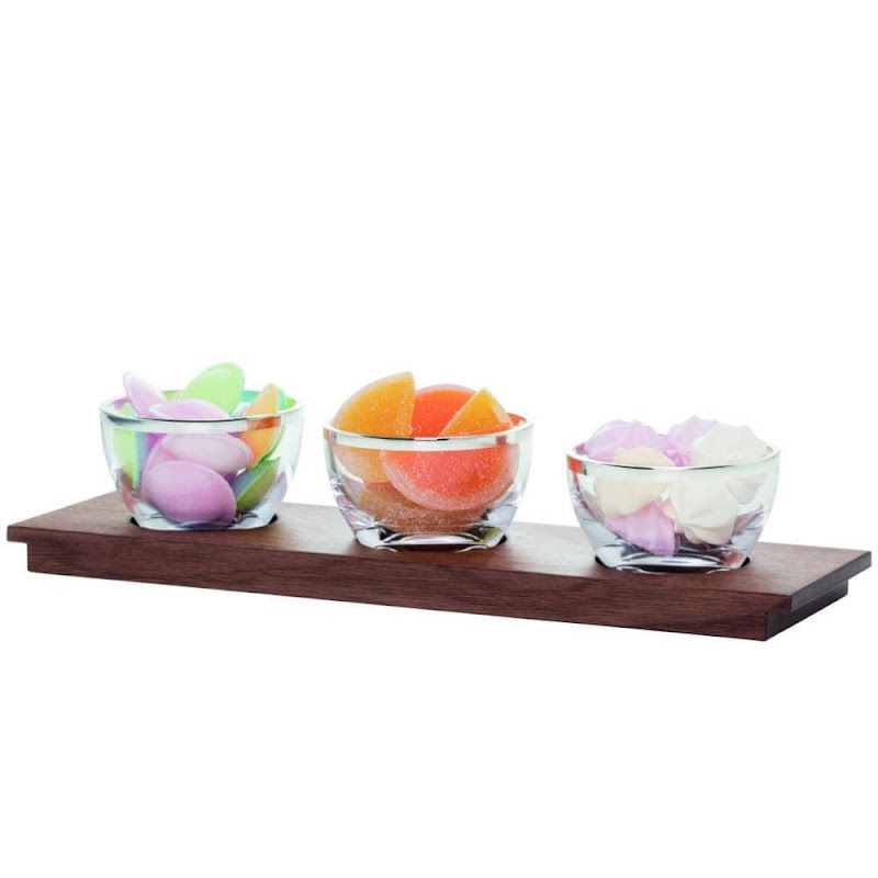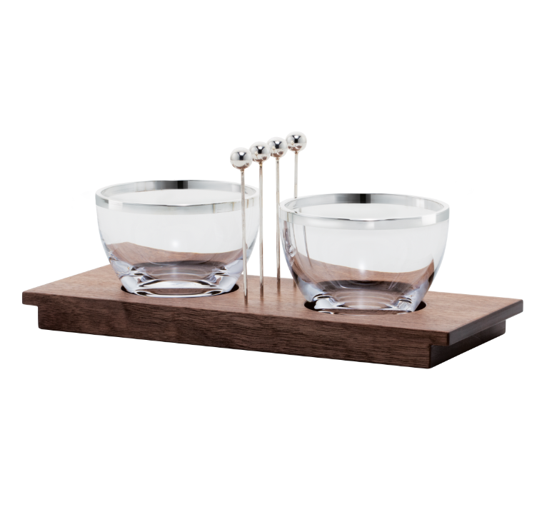 Glazen schaaltjes met zilverrand in houten tray