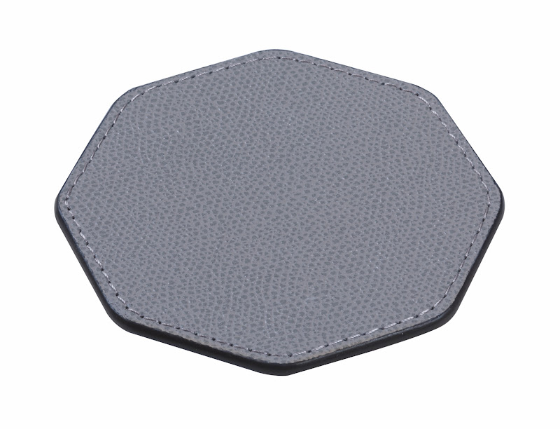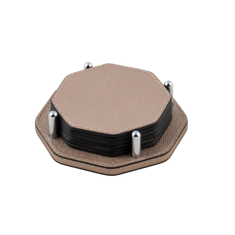 | Houder met 6 onderzetters achthoekig “David”. Basis van hout, bekleed met kalfsleer voorzien van metalen pennetjes. De onderzetters zijn volledig leer en zijn semi-flexibel en waterbestendig.