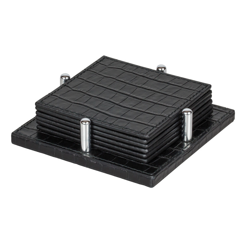 | Houder met 6 onderzetters vierkant “David”. Basis van hout, bekleed met kalfsleer voorzien van metalen pennetjes. De onderzetters zijn volledig leer en zijn semi-flexibel en waterbestendig.