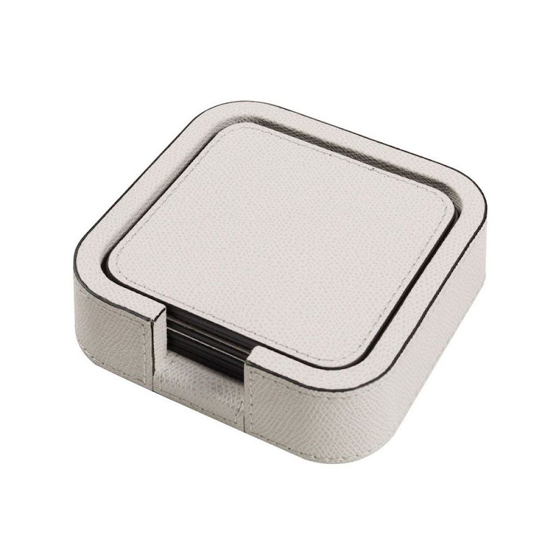| Houder met 6 onderzetters vierkant met afgeronde hoeken “Tao”. De houder is gemaakt van hout en bekleed met kalfsleer. De onderzetters zijn volledig leer en zijn semi-flexibel en waterbestendig.