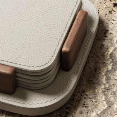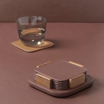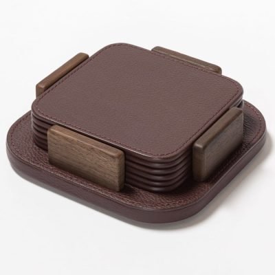 Set van 6 Pelle Frau ® leren onderzetters in met leer beklede houder die is voorzien van walnoot houten supports.