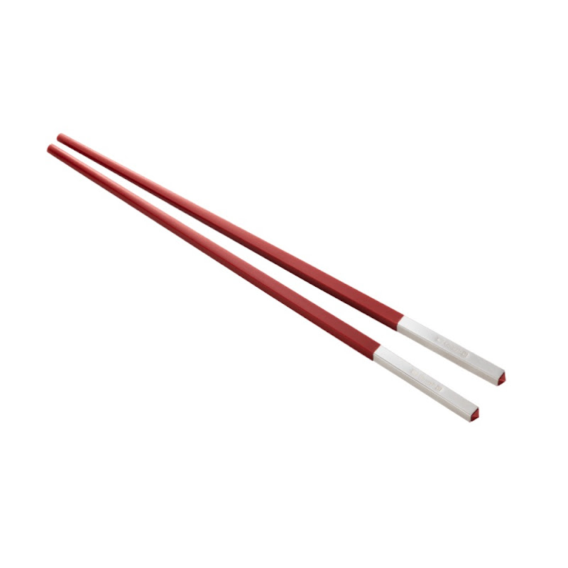 Deze set bevat een paar Chinese eetstokjes Uni Rood gemaakt van kunsthars met een verzilverde greep en een verzilverde houder uit de Vertigo collectie
