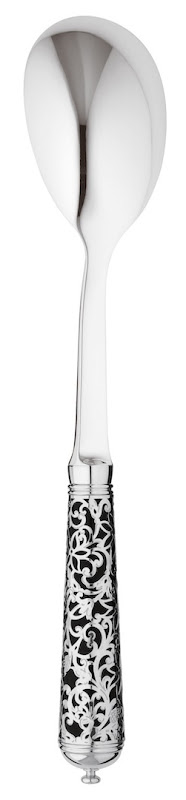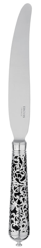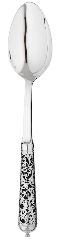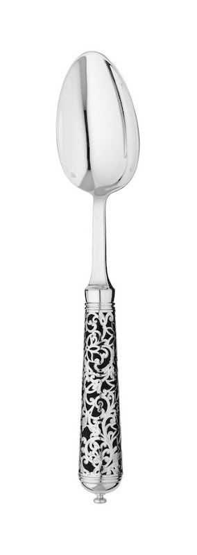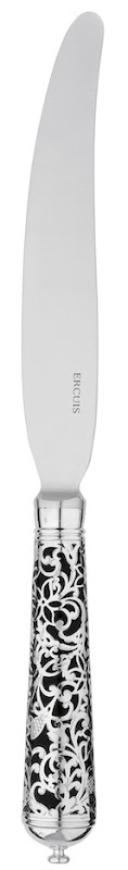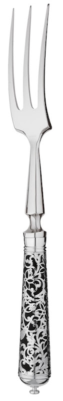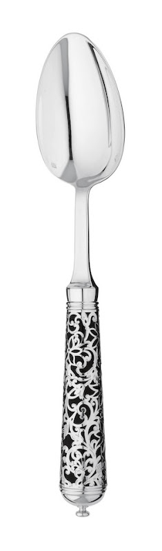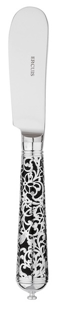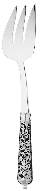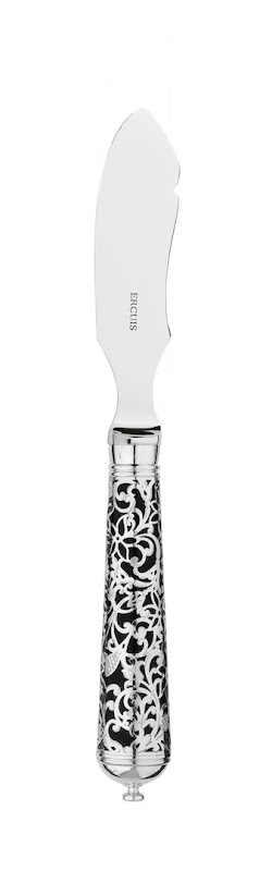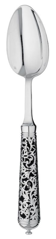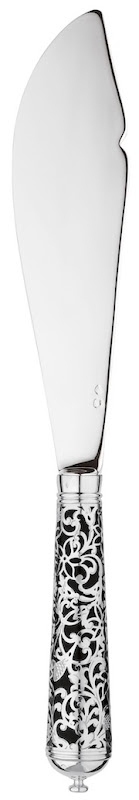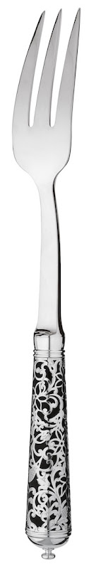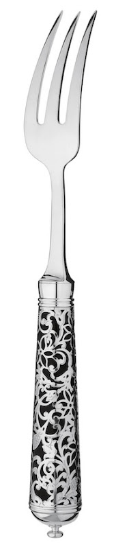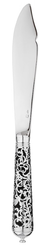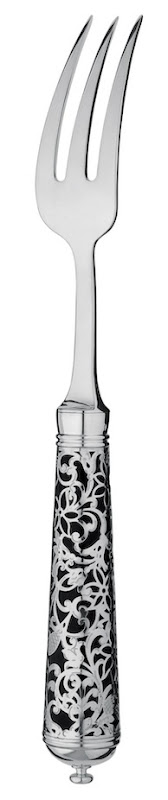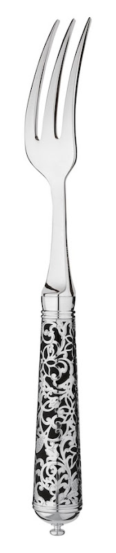 De helder gekleurde handvatten van dit bestek zijn bedekt met een met filigrain patroon van arabesken uitgevoerd in sterling zilver.
