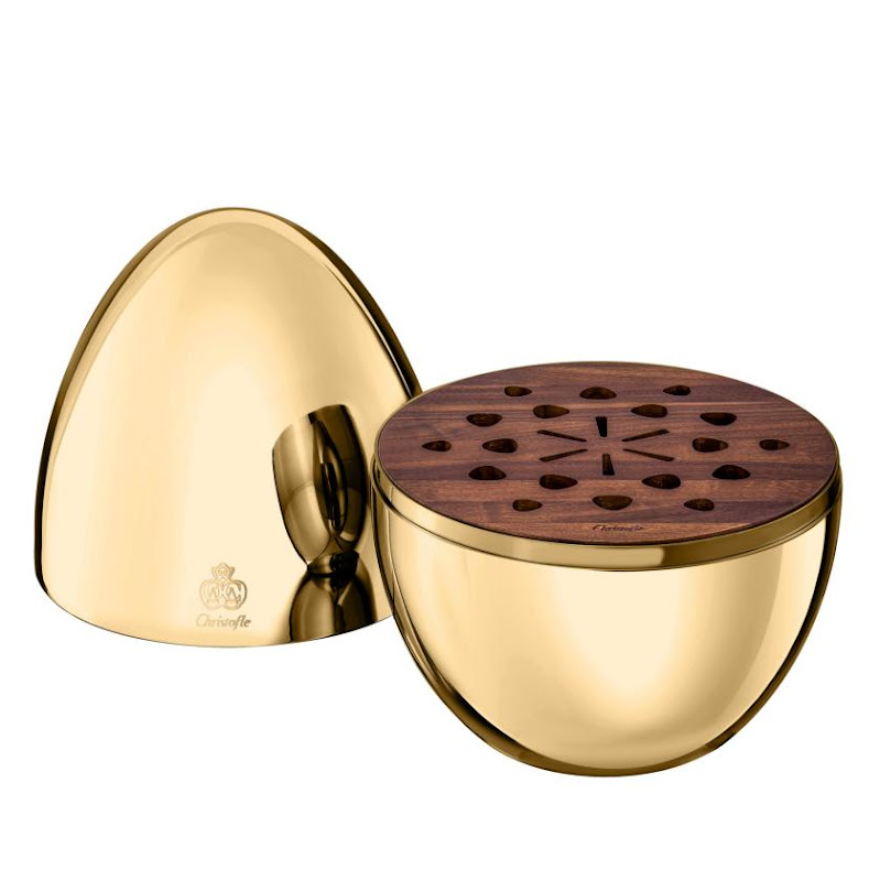 Het bestek ligt door zijn ergonomische vorm bijzonder prettig in de hand en wordt binnen het ei op zijn plaats gehouden door een schijf van walnoot hout