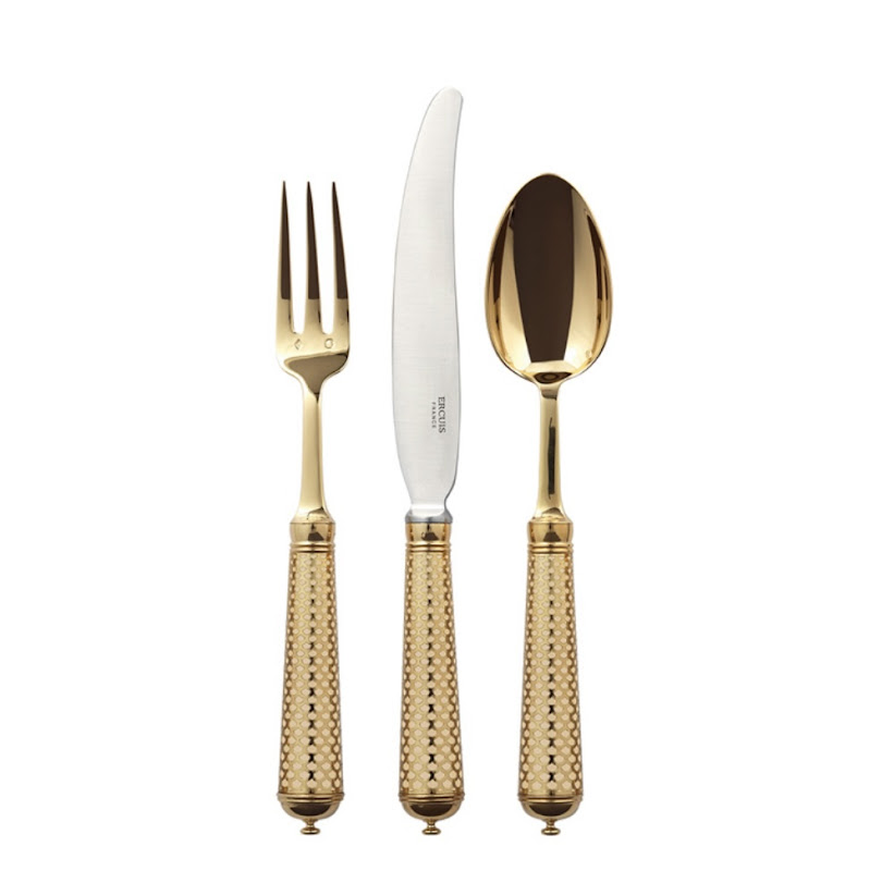 De helder gekleurde handvatten van dit bestek zijn bedekt met een met filigrain patroon van schelpen uitgevoerd in verguld sterling zilver