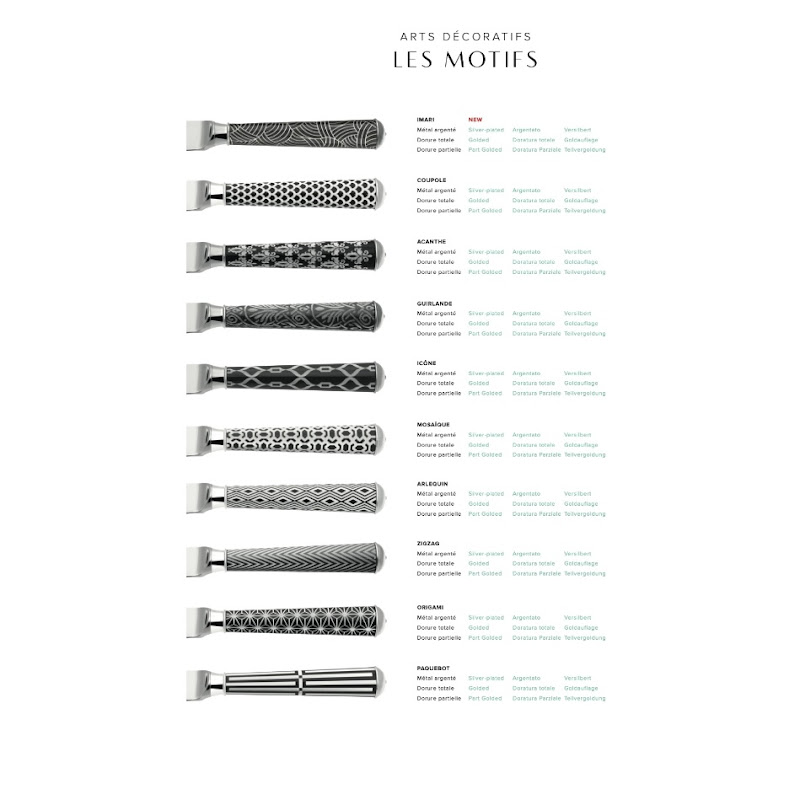 Het bestek wordt voorzien van een laklaag, vervolgens gegraveerd in één van de 10 guilloche patronen waarna het wordt verzilverd, verguld of deel-verguld.