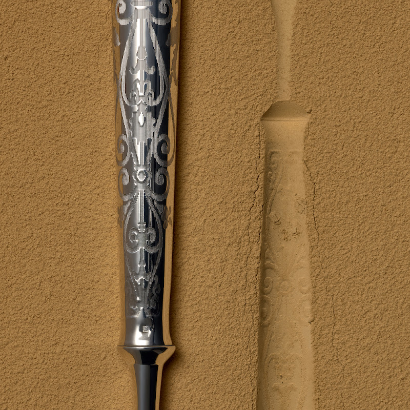 Met deze decoratie techniek worden delicate, geometrische patronen van slechts een tiende van een millimeter breed op de heften gegraveerd