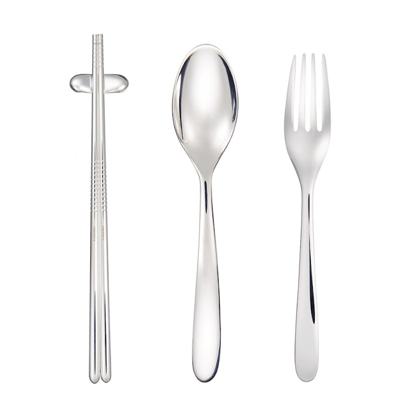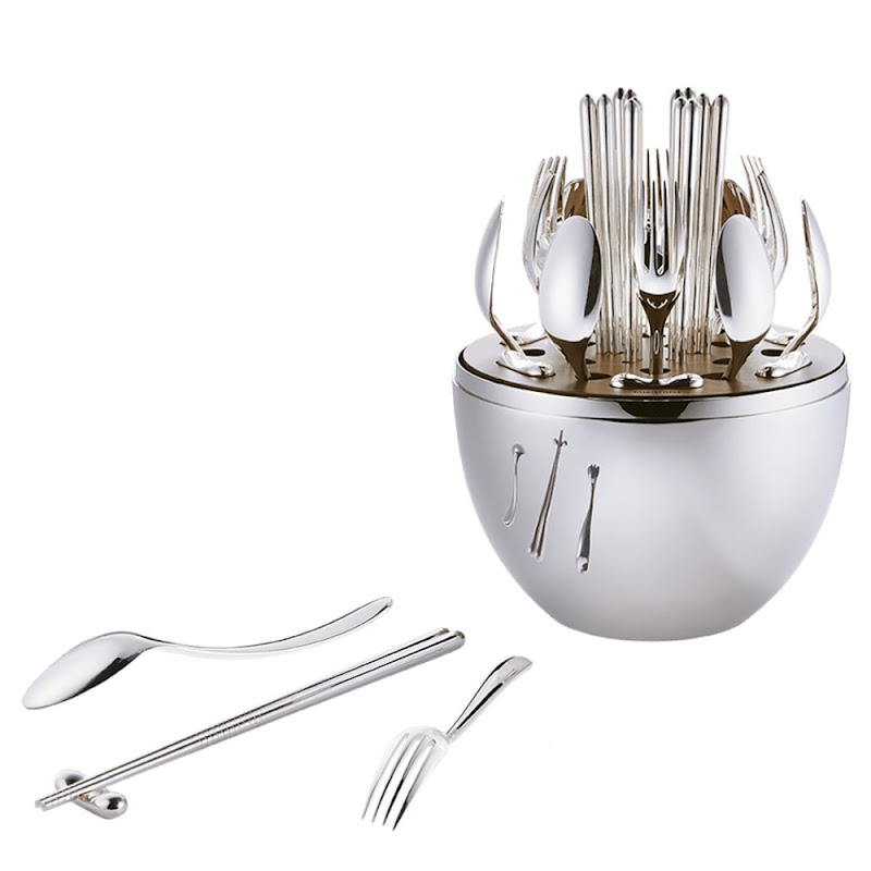Zwaar verzilverd 24 delig 'Aziatisch' bestek in roestvrijstalen opberg 'ei'