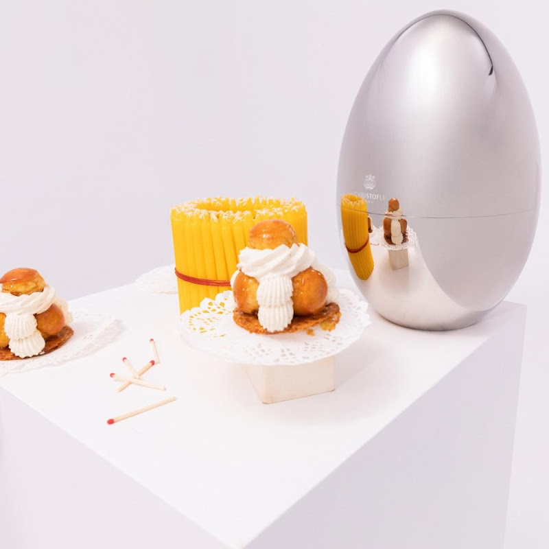 Het bestek ligt door zijn ergonomische vorm bijzonder prettig in de hand en wordt binnen het ei op zijn plaats gehouden door een schijf van walnoot hout.