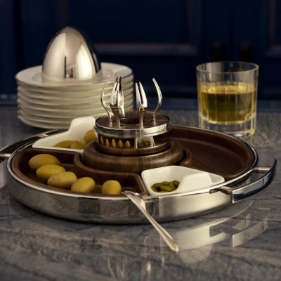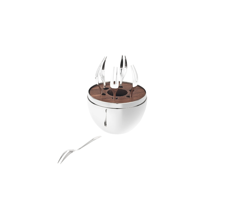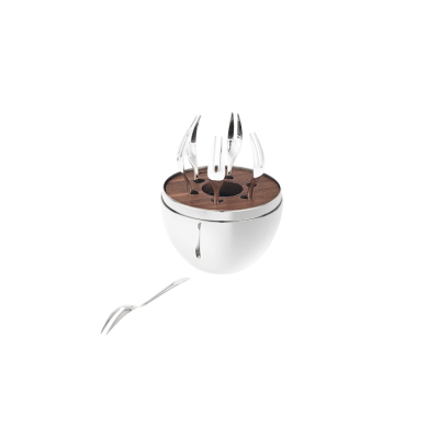 Set van 6 kleine verzilverde cocktailvorkjes in een gepolijste roestvrij stalen houder, met een inleg van hout, ontworpen om ervoor te zorgen dat de vorkjes perfect op hun plaats blijven.