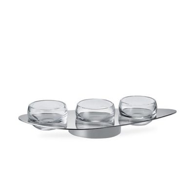 Plateau met 3 glazen schaaltjes, voor het serveren van nootjes, olijven e.d. 25.4 cm, H. 10 cm.