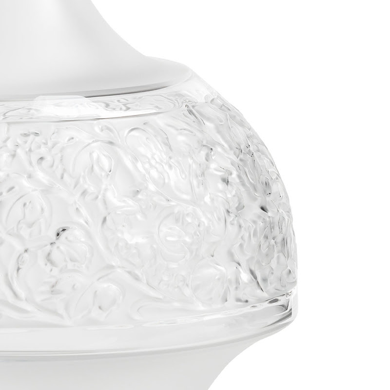 Gemarkeerd door gesatineerd kristal loopt er een band van bladeren en druiven over de karaf. De stop heeft hetzelfde motief. De losse basis van wit marmer helpt de wijn koel te houden