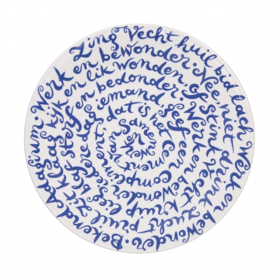 | Bord ‘Samenwerken’. De tekst op het bord luidt: Zing, vecht, huil, bid, lach, werken bewonder. Bekend adagium. Werk en bewonder. Nee, niet: drink, zucht, pruil, zit, klaag, kijk en lik wonden. Of stink, vecht, kruip, lieg, blaf, sterf en bedonder. Werk, en bewonder iedere dag iemand, geef een compliment, dat is het cement van samenwerken.
