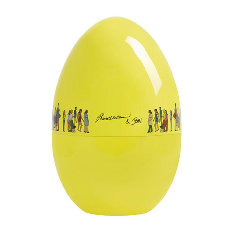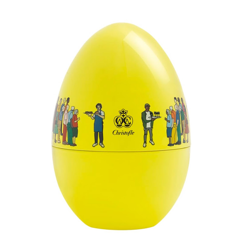 Zwaar verzilverde 24 delige bestekset in geel gelakt roestvrijstaal opberg 'ei' met afbeeldingen van de 'Happy few'