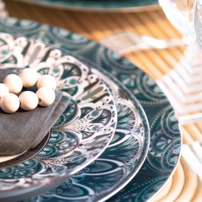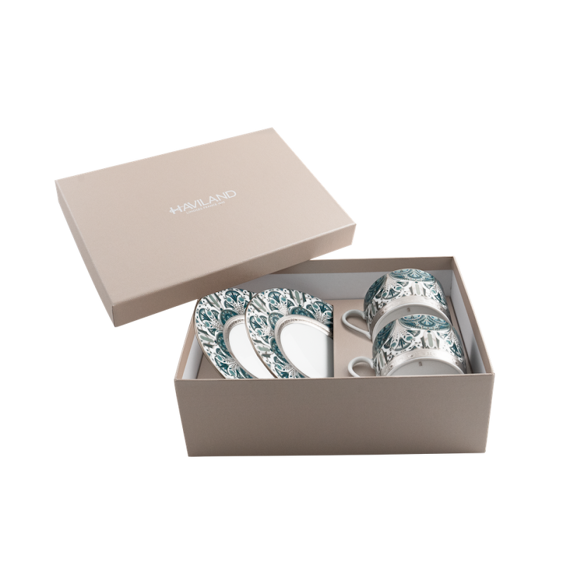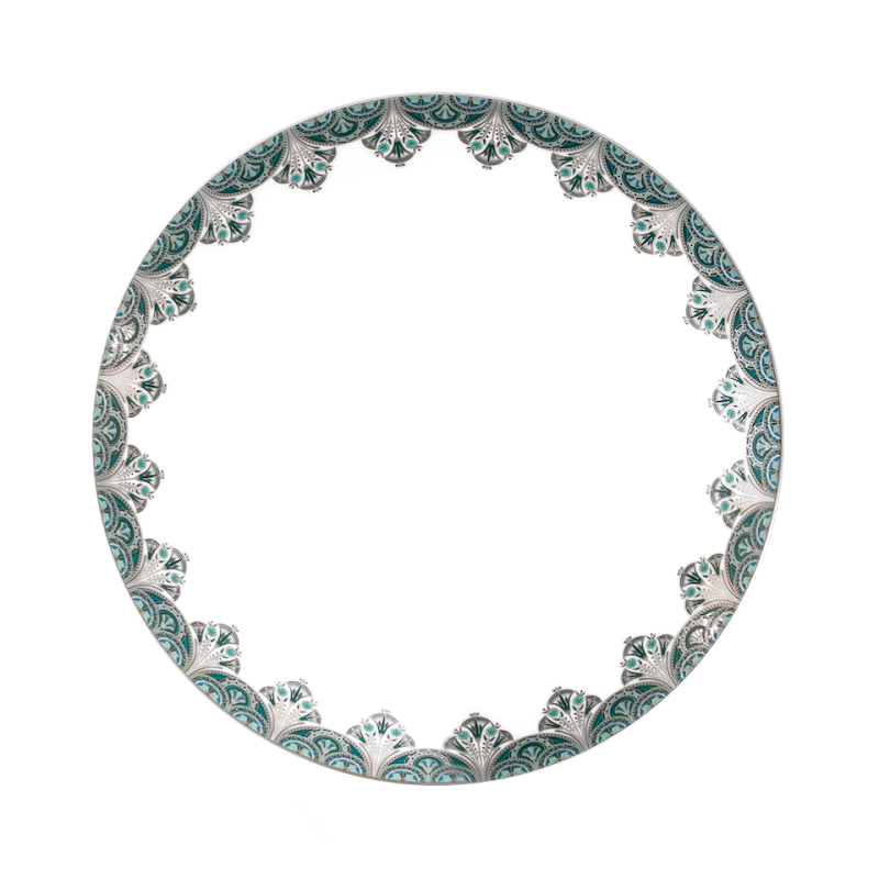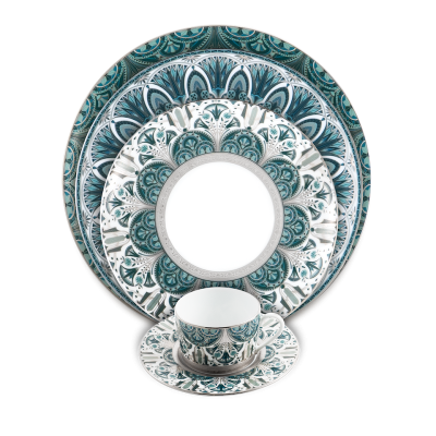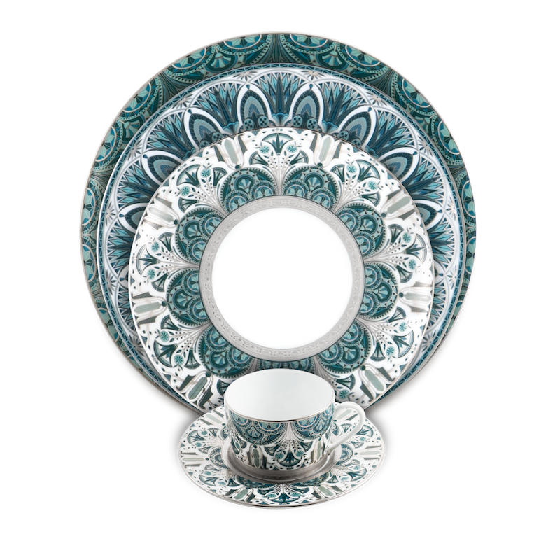 Decor geinspireerd op oude Egyptische motieven en verfijnd met platina reliëfrand welke vaatwasmachinebestendig is