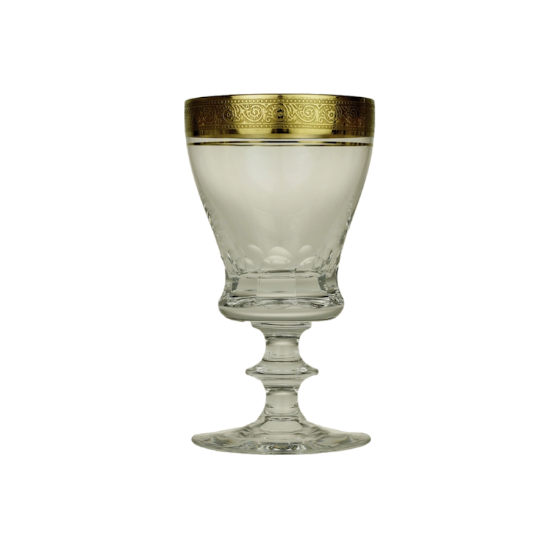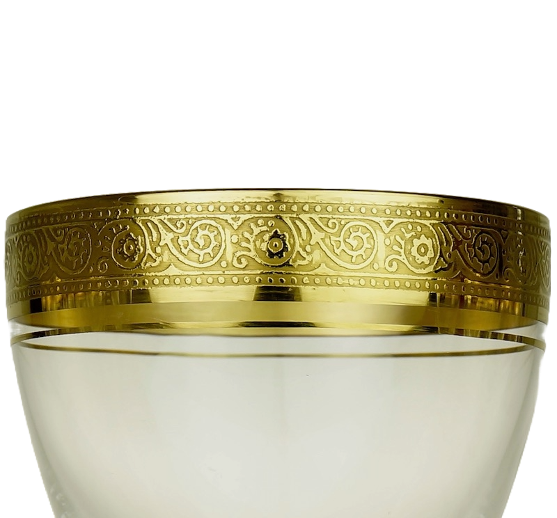 De glazen hebben een zgn. 'Mintonborte', een 24 karaat ets-gouden rand, gecombineerd met een prachtig slijpmotief