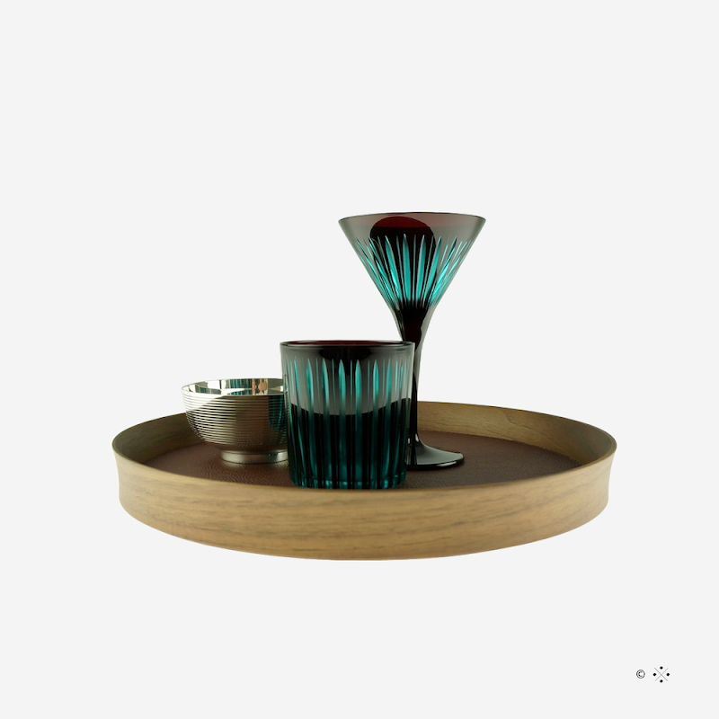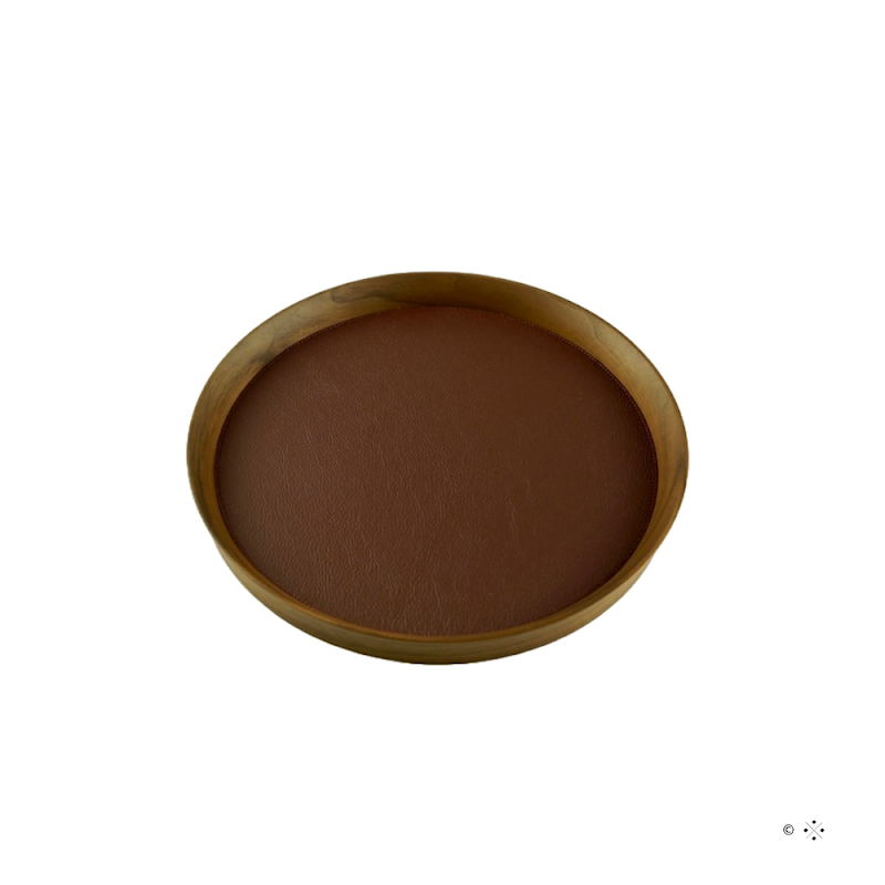 Met Pelle Frau ® leer ingelegd, rond, walnoot houten dienblad