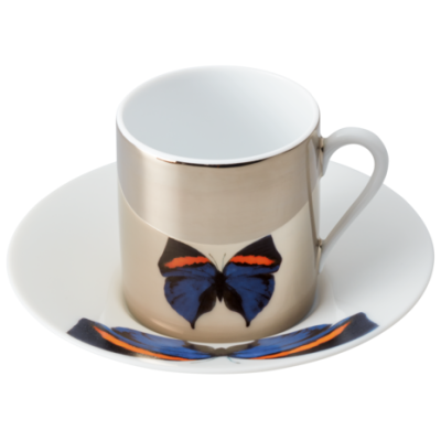 Set van 4 espressokop en schotels met platina kopje en schotel met afbeelding van een vlinder