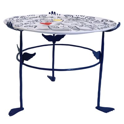 Aardewerk blad op gepoedercoat smeedijzeren onderstel.