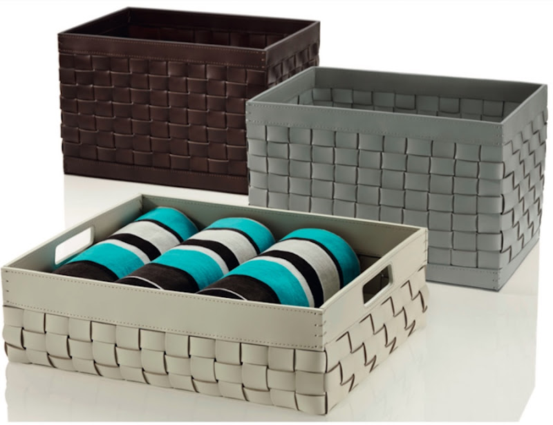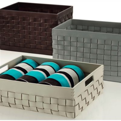 Rechthoekige mand van gevlochten leer in grijs