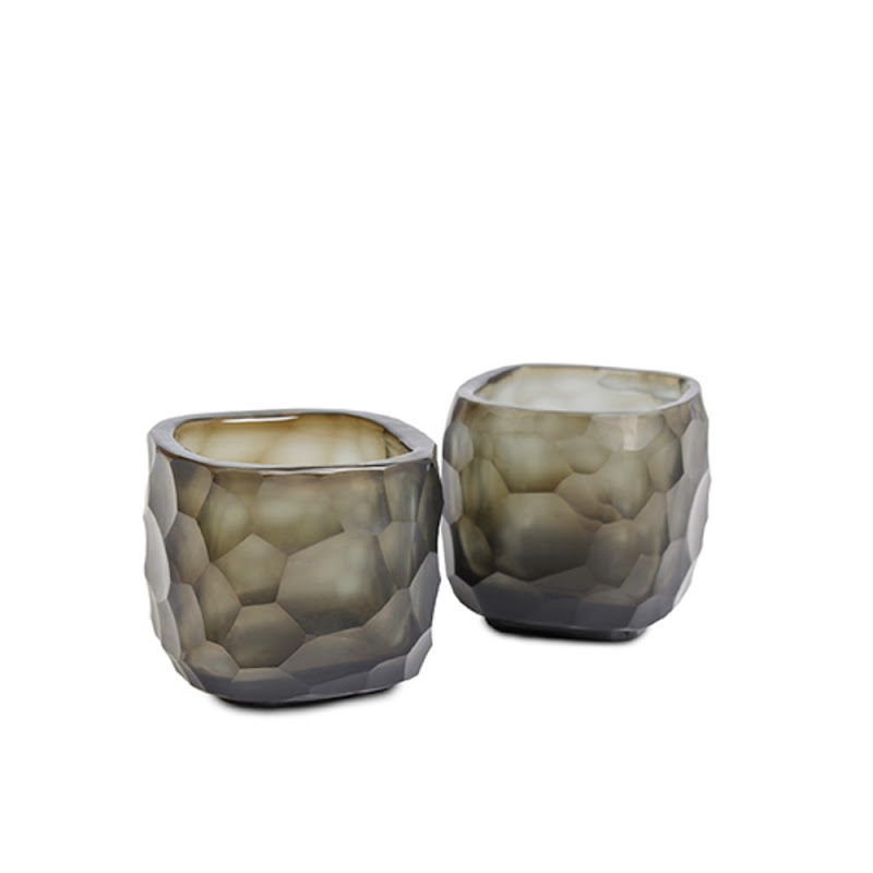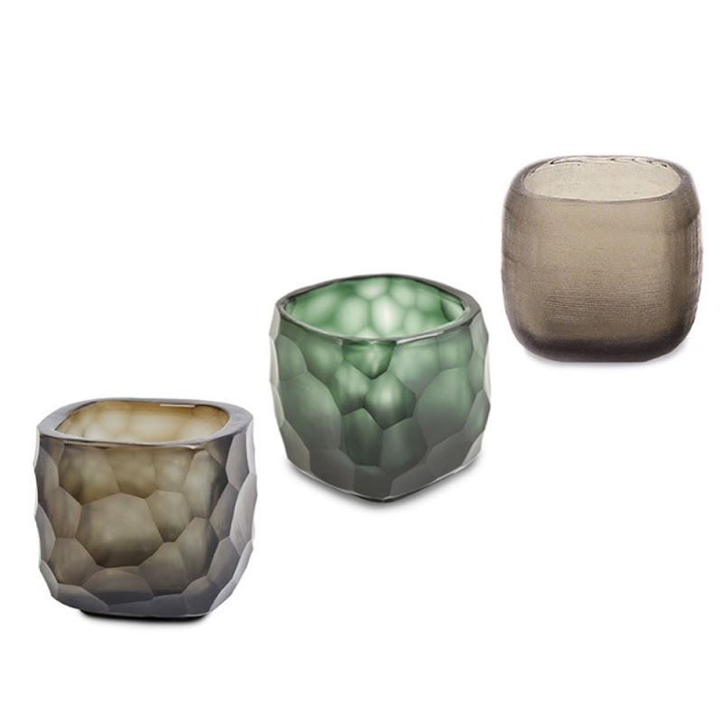 Glazen waxinehouders in de kleuren Indigo, Smoke Grey en Dark Green