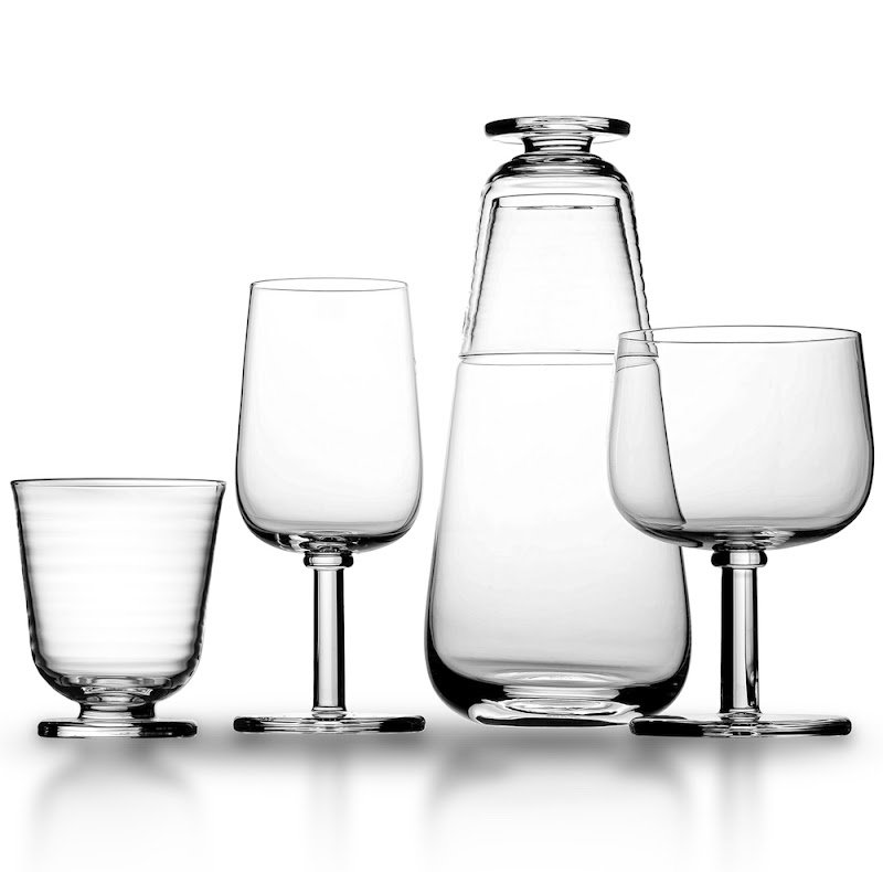 Een kleine serie glazen, die allemaal multifunctioneel zijn. Het glas met de brede kelk is geschikt voor rode wijn, maar ook voor bier of Gin/tonic. Het glas met de smalle hoge kelk kan niet alleen voor witte wijn, maar ook voor een rode Bordeaux, een Cava of een dessertwijn worden gebruikt en het waterglas kan ook als sapglas of wijnglaasje dienen. De kan met het glaasje als 'stop' is ook perfect als 'water' setje voor naast het bed.