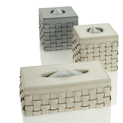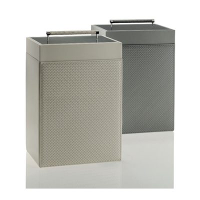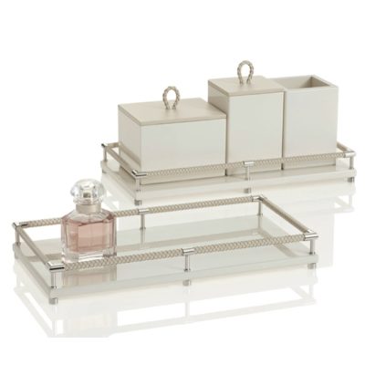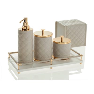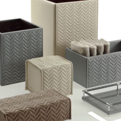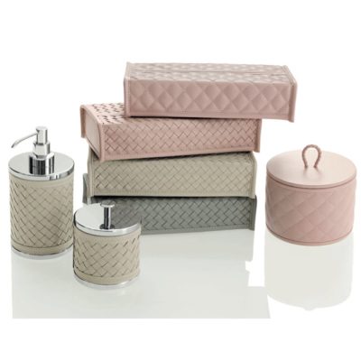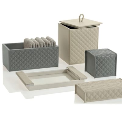 Een brede collectie badkameraccessoires, uitgevoerd in kalfsleer en/of gelakt hout. Sommige accessoires , zoals het zeeppompje en de doosjes, zijn afgewerkt met verchroomde of vergulde elementen.
