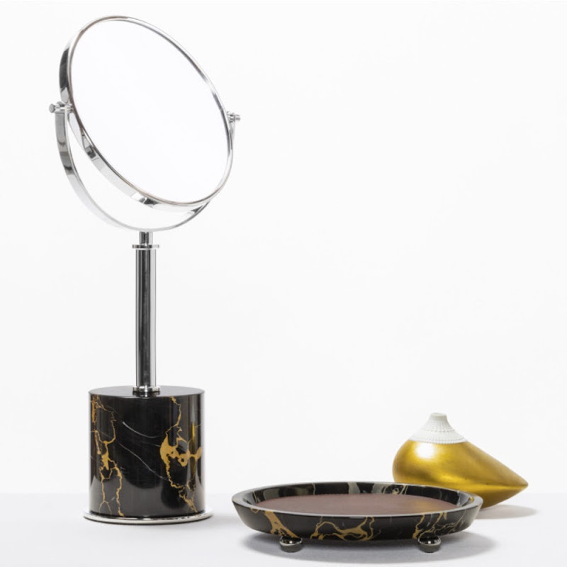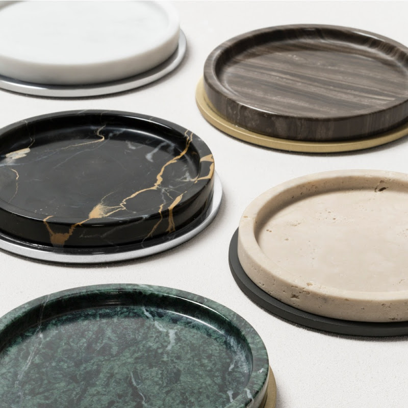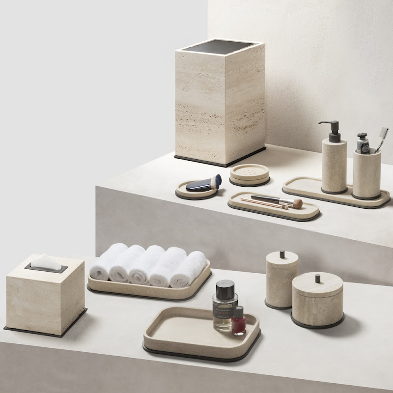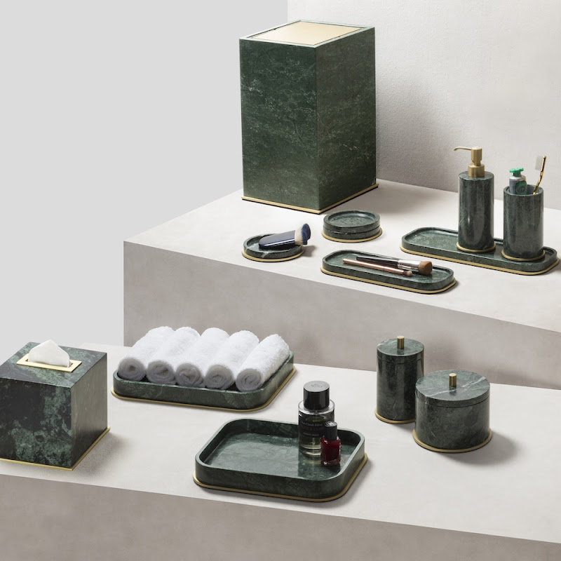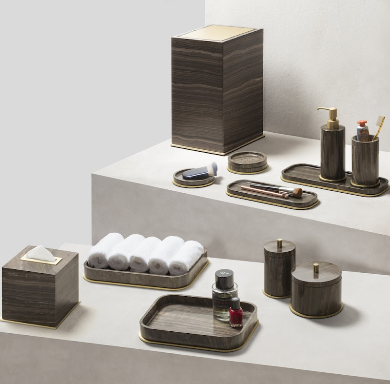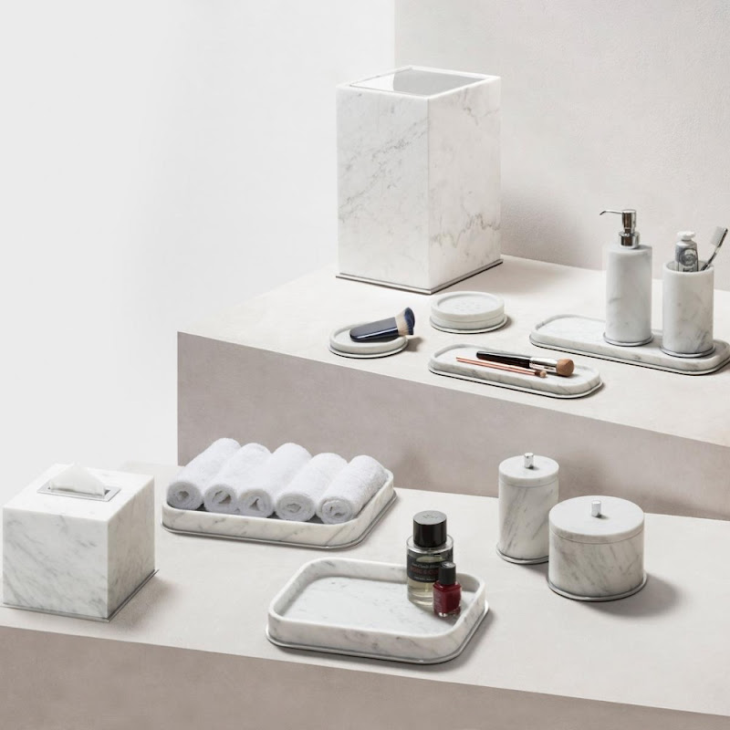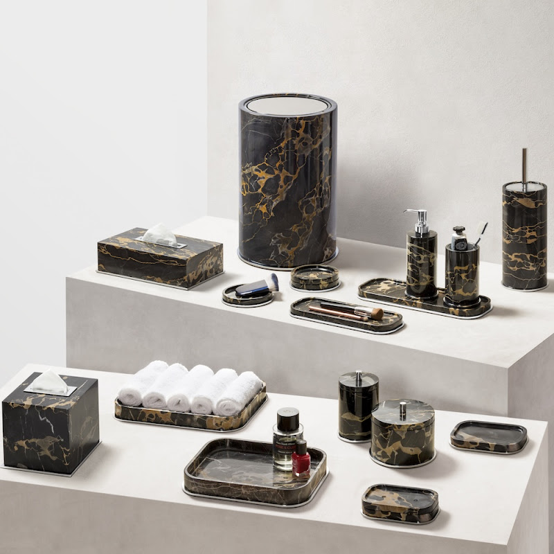 "Positano" marmeren badkamer accessoires afgewerkt met metaal en een antislip, waterbestendige rubberen onderkant.
