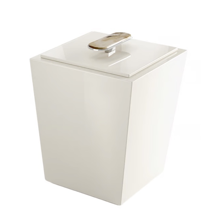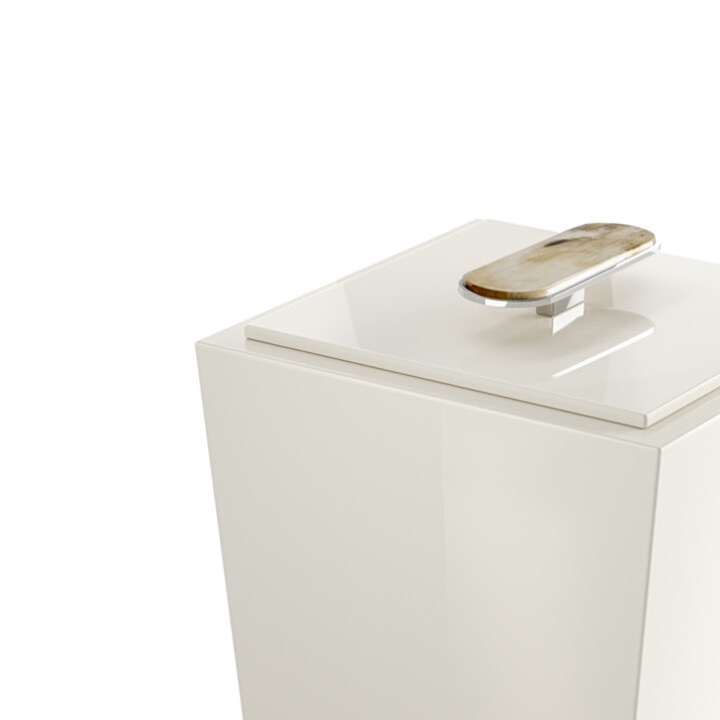 Glanzend ivoor gelakt hout. De greep van de deksel is gemaakt van hoorn en verchroomd messing
