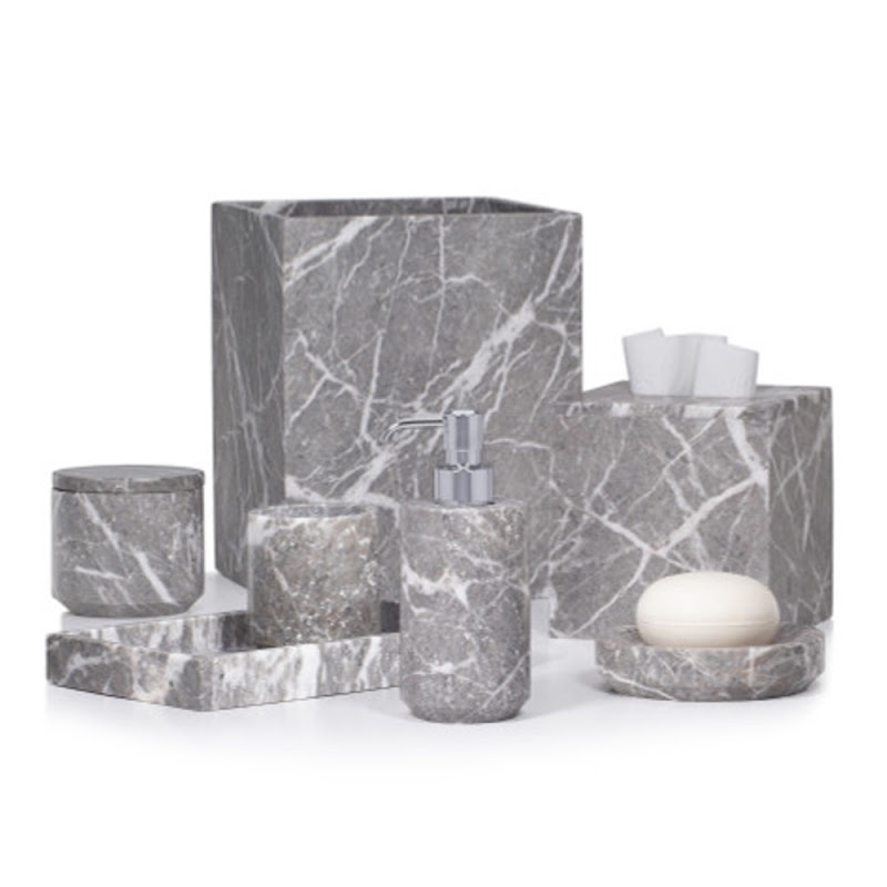 Deze grijze badaccessoirecollectie is met de hand vervaardigd uit fijn gepolijst marmer. Natuurlijke kleuren en patronen maken elk stuk uniek