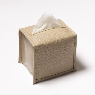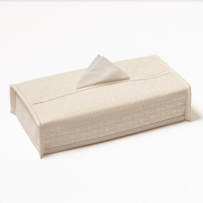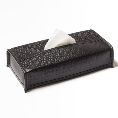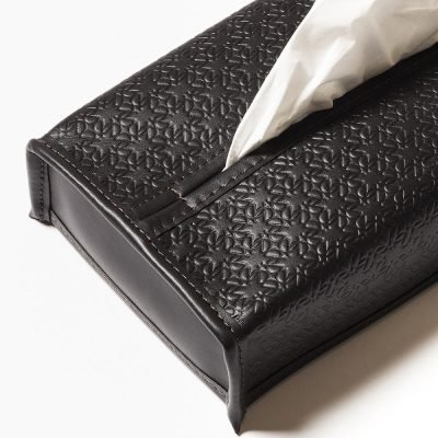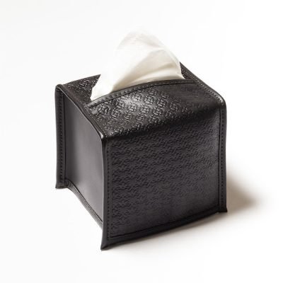 Volledig lederen tissuebox houder met ELIE SAAB monogram patroon.