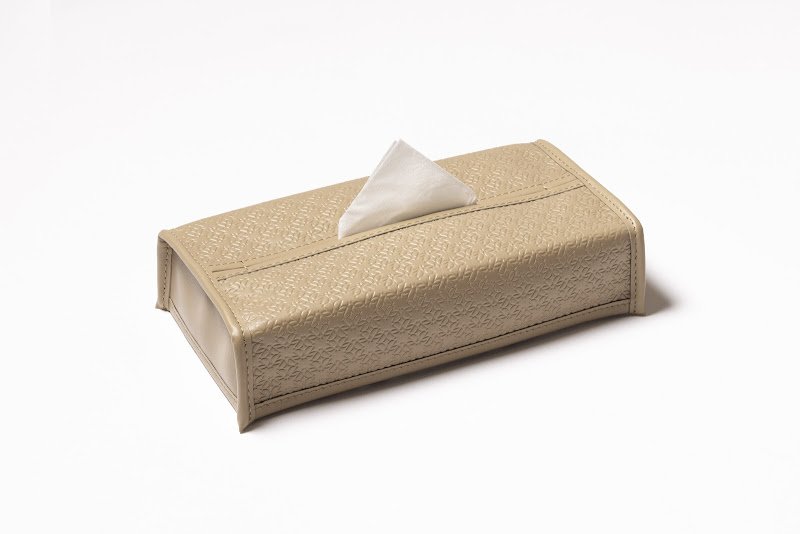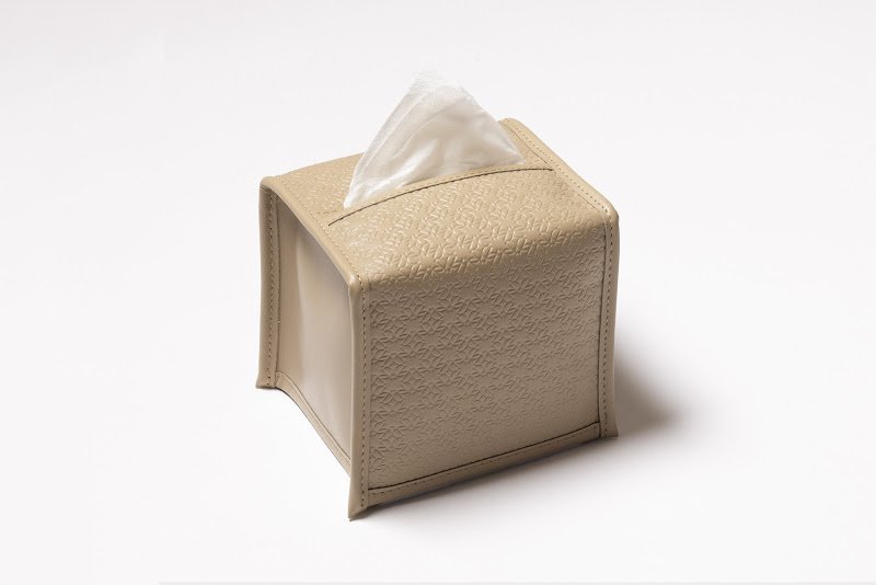 Volledig lederen tissuebox houder met ELIE SAAB monogram patroon.