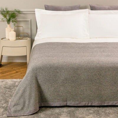 Tuileries is een plaid van zuiver kasjmier met een visgraat-tweed chevronpatroon, afgewerkt met een rand van daimsuède