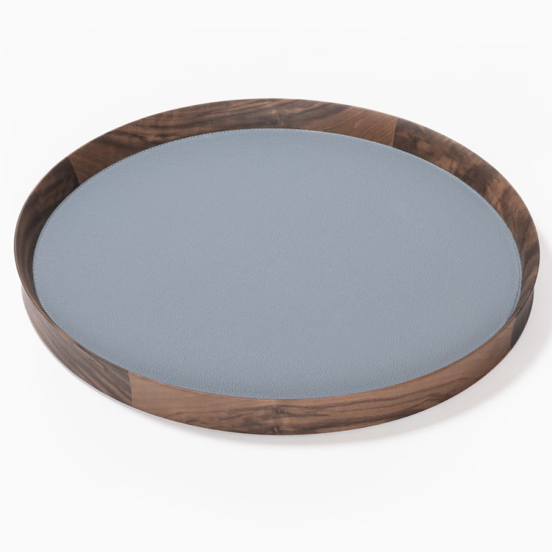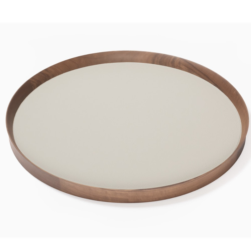 Met Pelle Frau ® leer ingelegd, rond, walnoot houten dienblad.