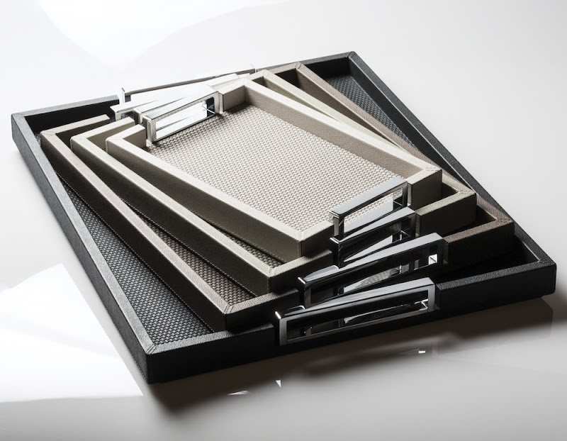 Met leer bekleed rechthoekig houten dienblad met handvatten in verchroomd metaal