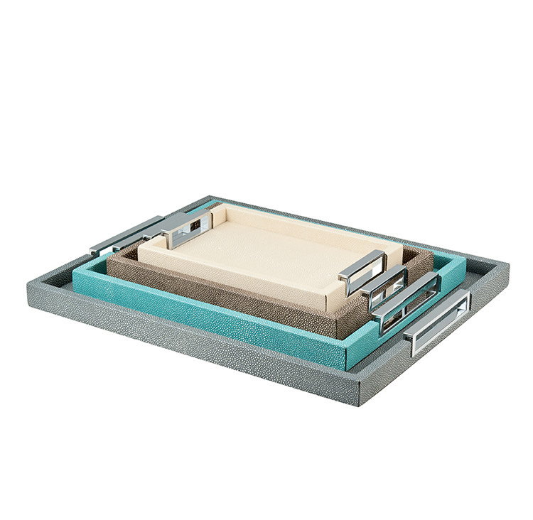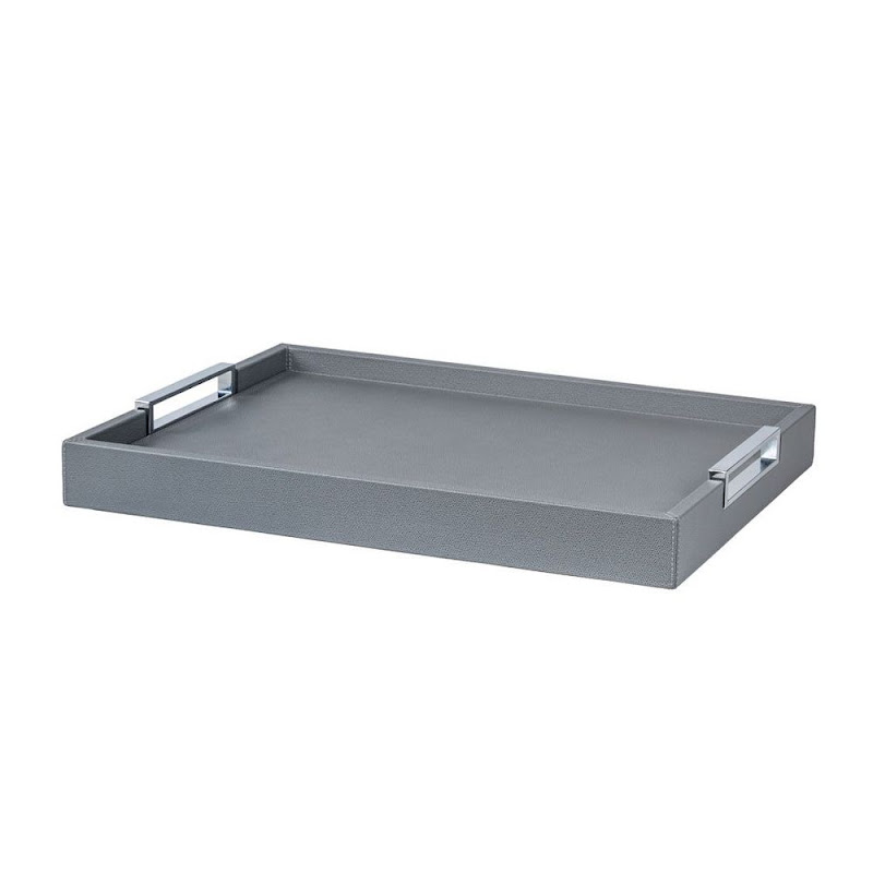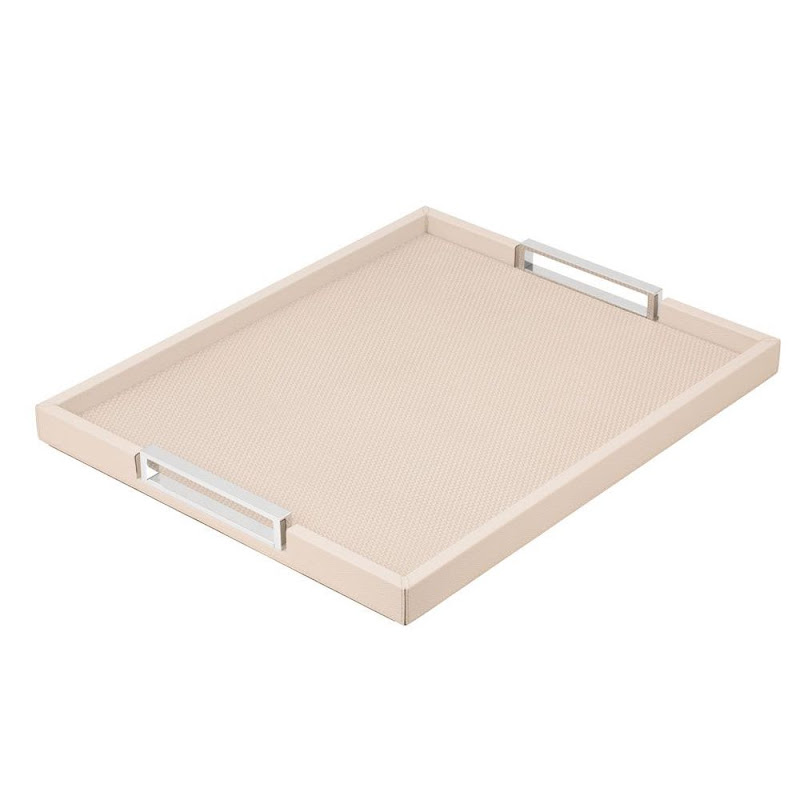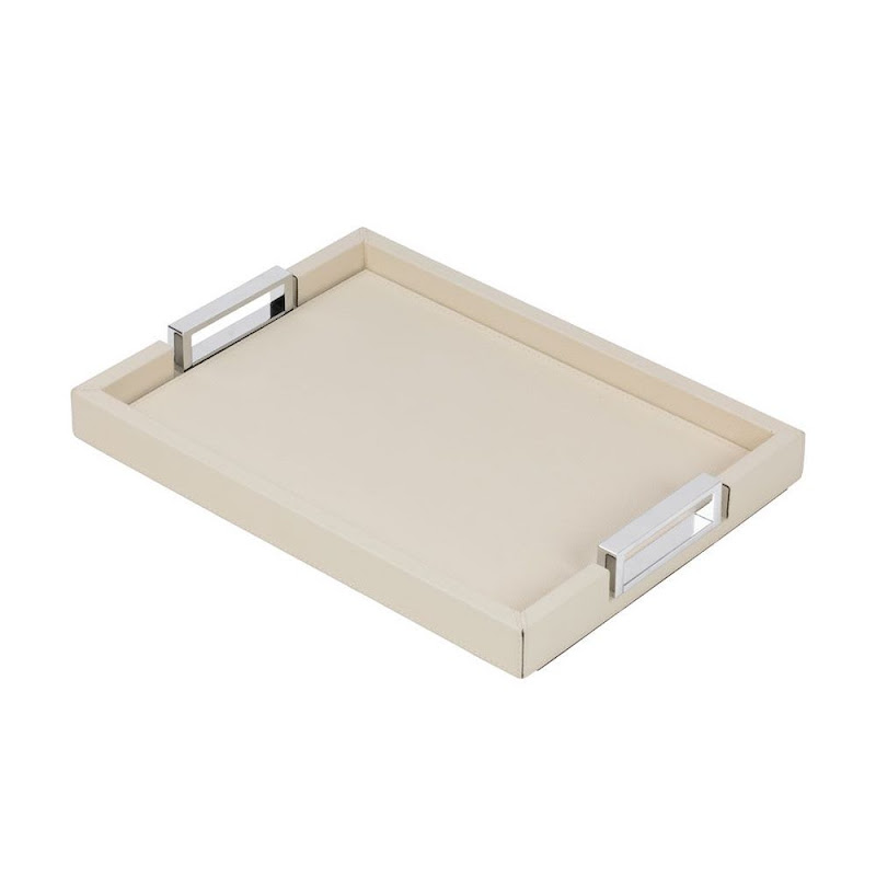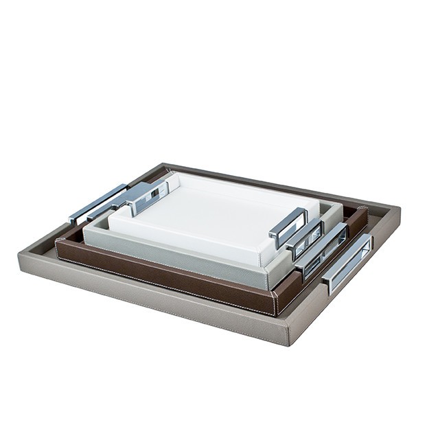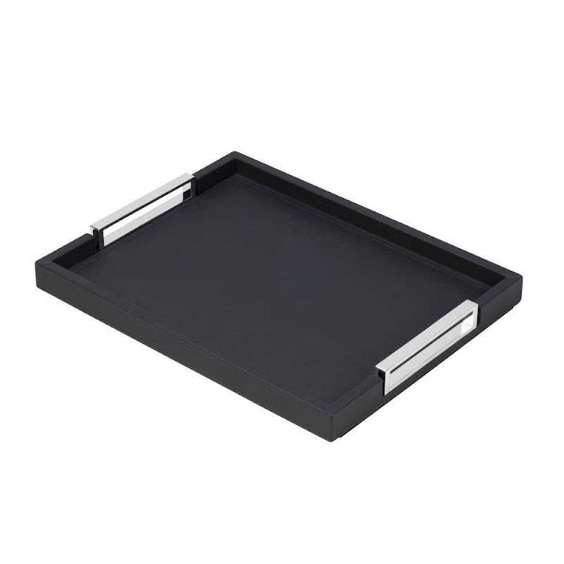 Met leer bekleed rechthoekig houten dienblad met handvatten in verchroomd metaal