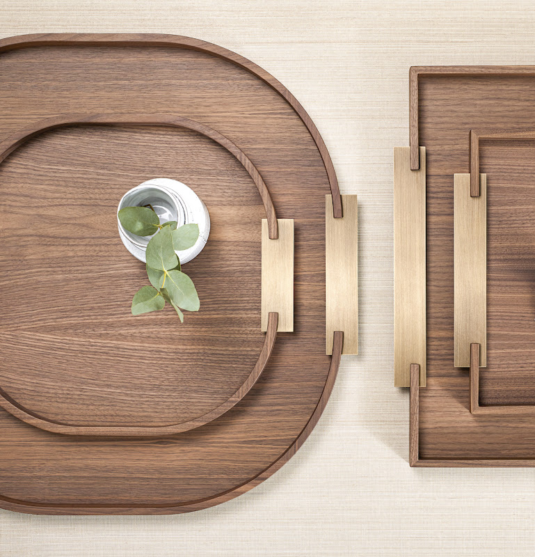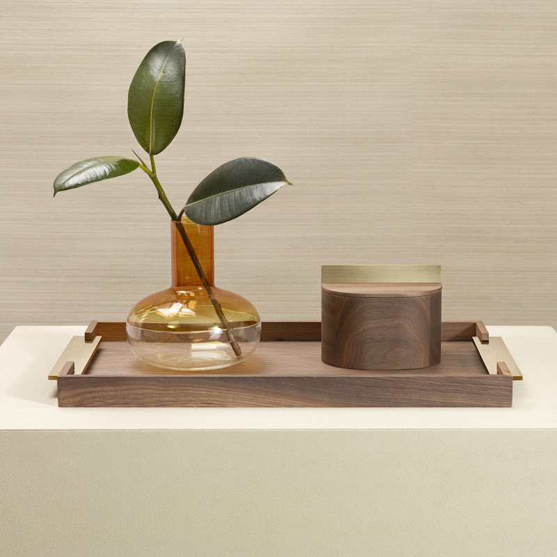 | Rechthoekig dienblad, gemaakt van Caneletto Walnoot met geborsteld bronzen grepen