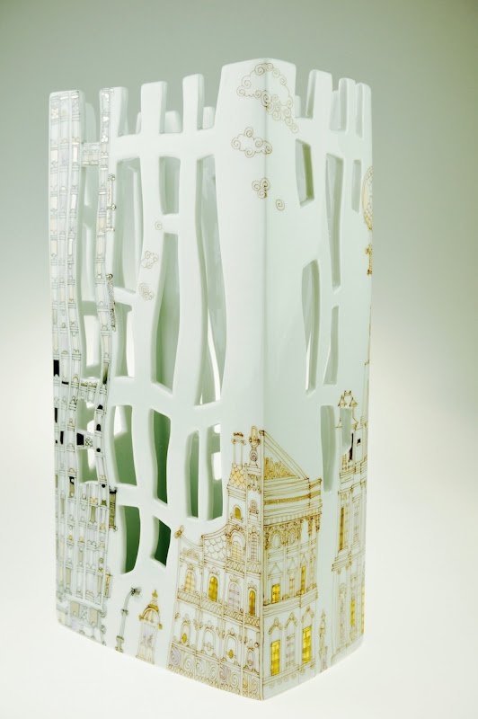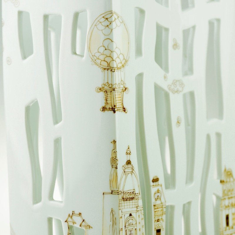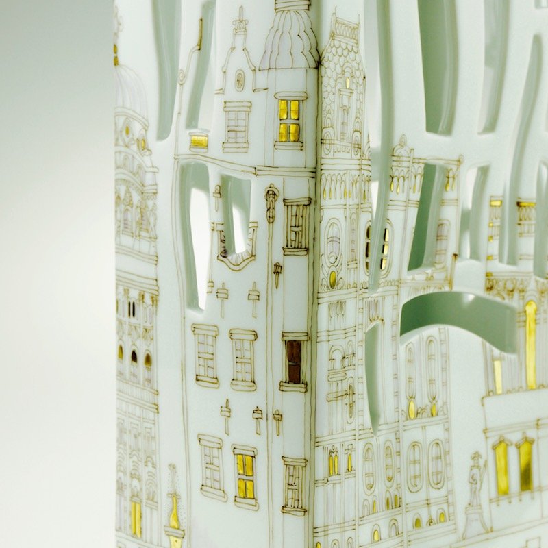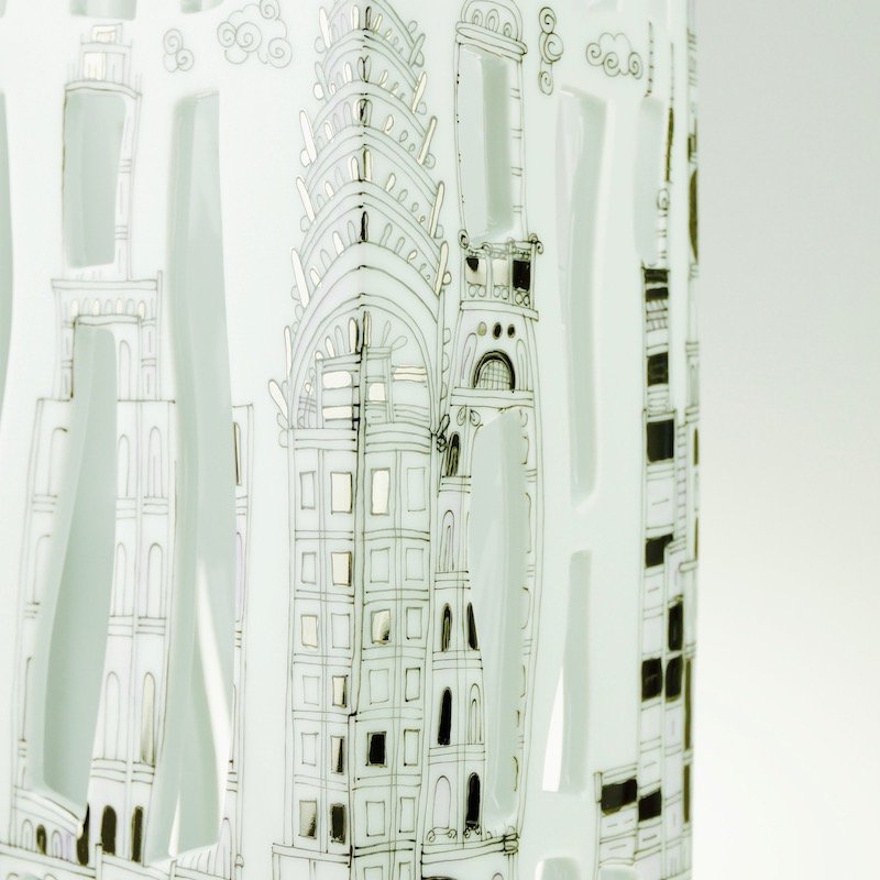 Volledig handgemaakte serie porseleinen vazen voorzien van handbeschilderde impressie van de steden Budapest en New York