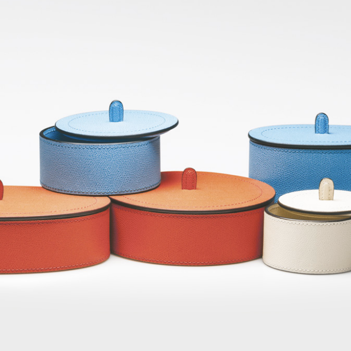 Met leer beklede ronde of ovale opbergdoos met deksel.