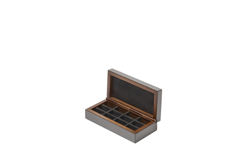Met leer beklede walnoot houten doos met 12 compartimenten.