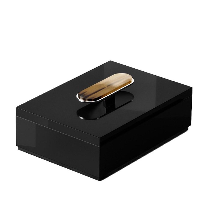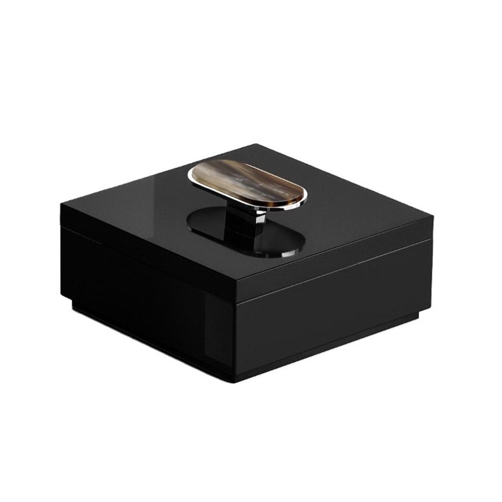 Glanzend zwart gelakt hout. Knop in hoorn en verchroom messing