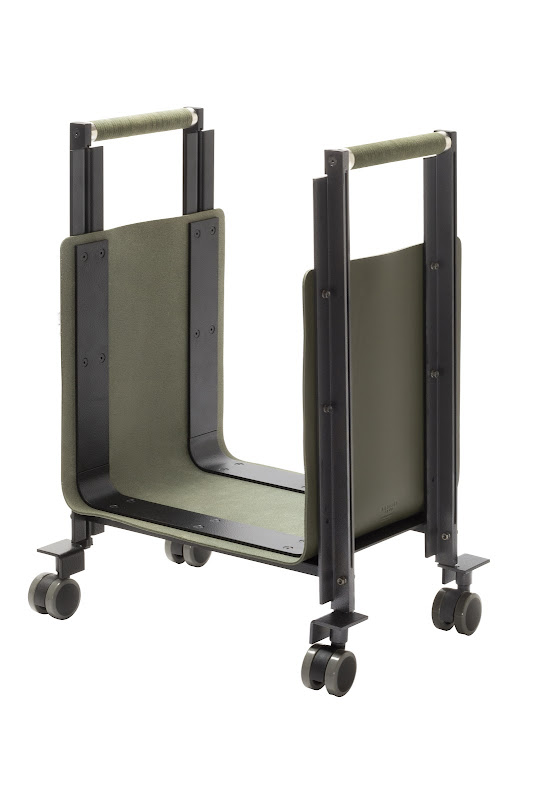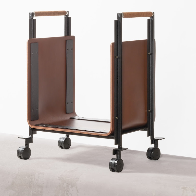 Donker kleurig metalen trolley, afgewerkt met zadelleer.