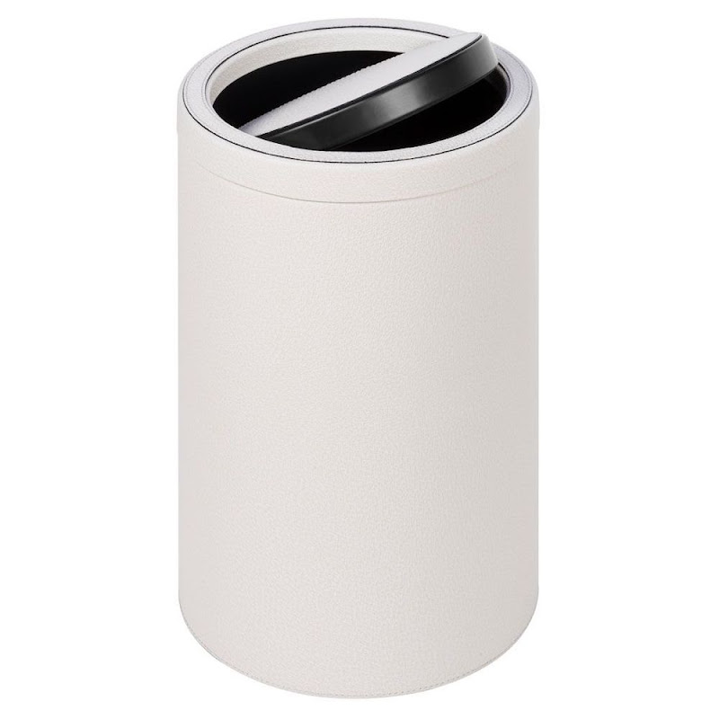 Prullenbak "Swing", met leer beklede stalen bak. Heeft een anti-sllip, waterbestendige rubber bodem. Het deksel is verwijderbaar zodat schoonmaken makkelijk is