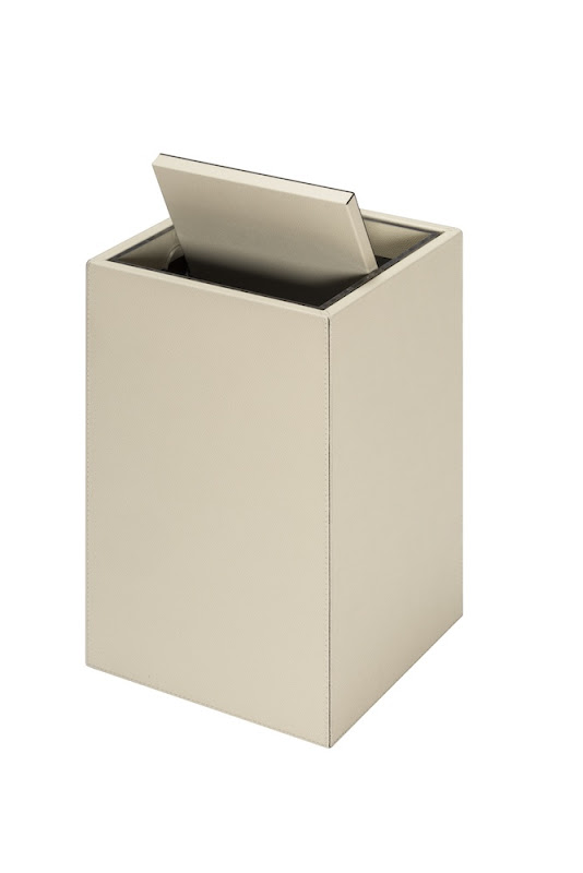 | Prullenbak “Swing”, met leer beklede stalen bak. Heeft een anti-sllip, waterbestendige rubber bodem. Het deksel is verwijderbaar zodat schoonmaken makkelijk is