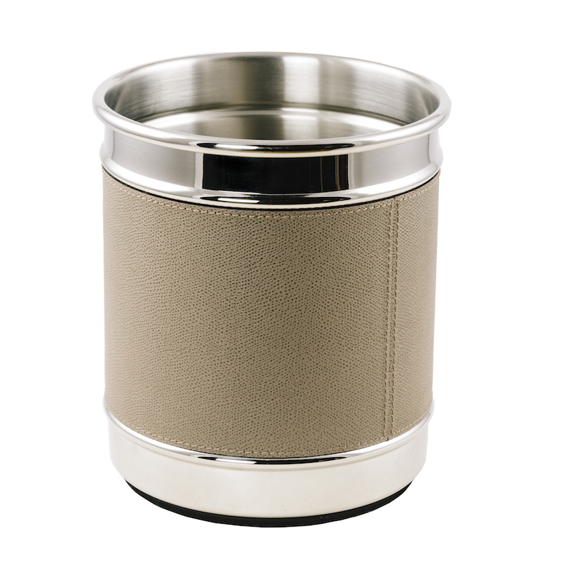 | Prullenbak “Raf” , gedeeltelijk met leer beklede rvs bak, gepolijst aan de buitekant, geborsteld aan de binnenkant. Rubber onder de bodem