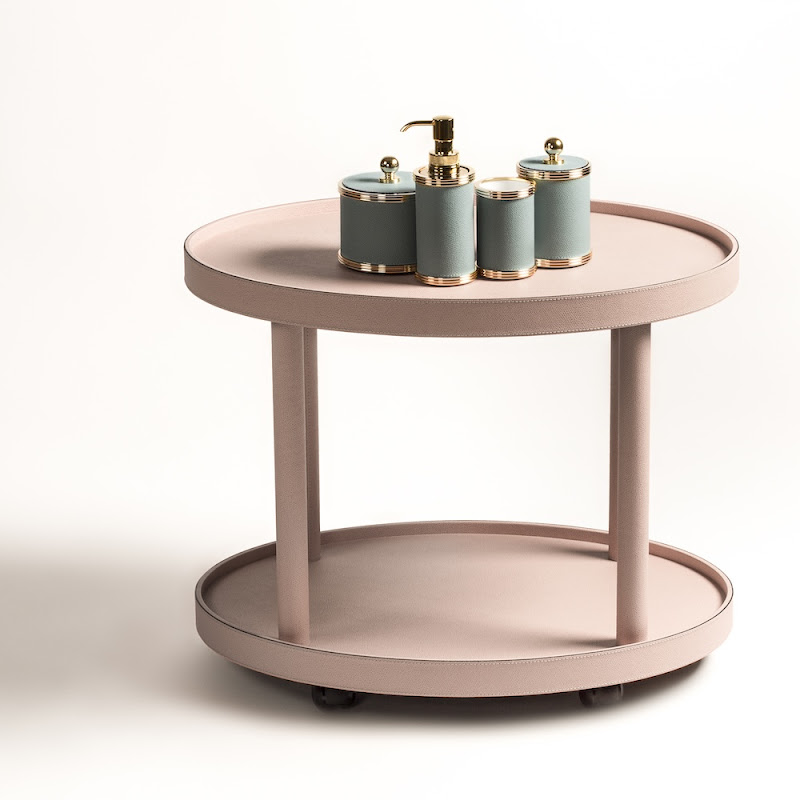 Met leer beklede houten trolley op wieltjes met afneembaar dienblad.